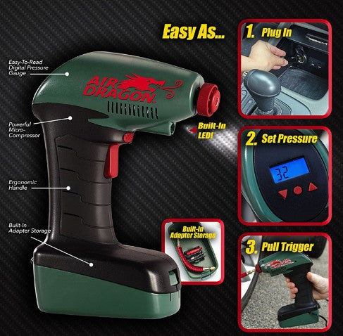 Easy to use, just plug into your car cigarette lighter for power, slip universal adapter over tire valve and be ready to inflate.
