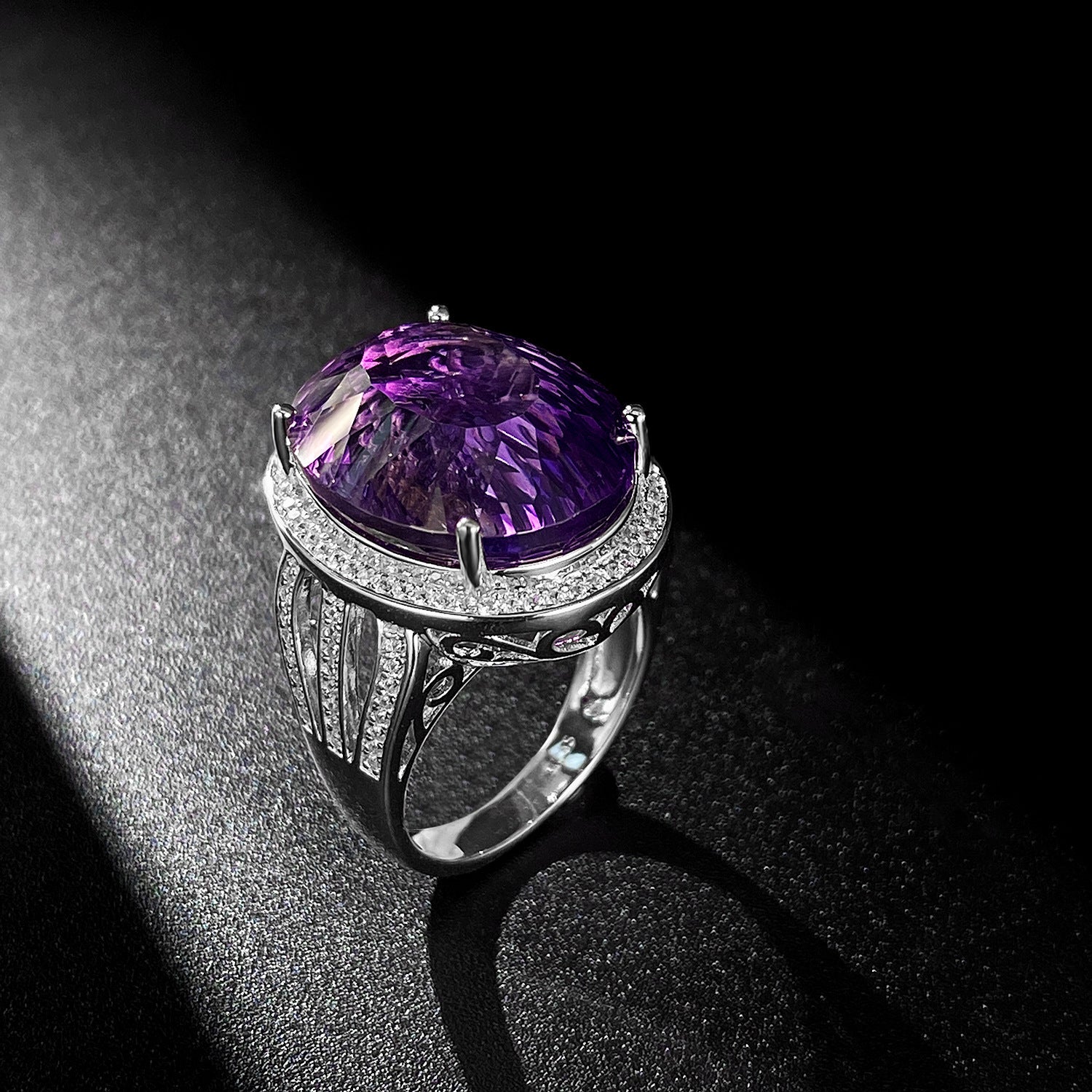 Light And Extravagant Wind Jewelry Large Denier Shaped Natural Amethyst Ring S925 Silver Set Crystal